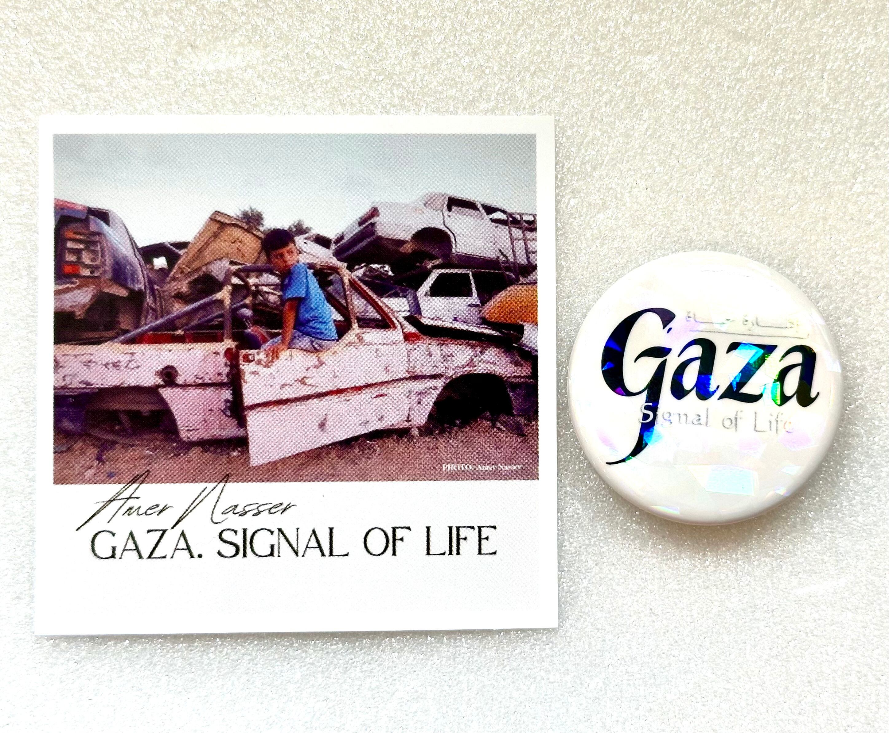直径3.5cmのサイズで、ホログラムが光を反射し、ガザの生命の光を伝えています。このバッジを身に着けることで、